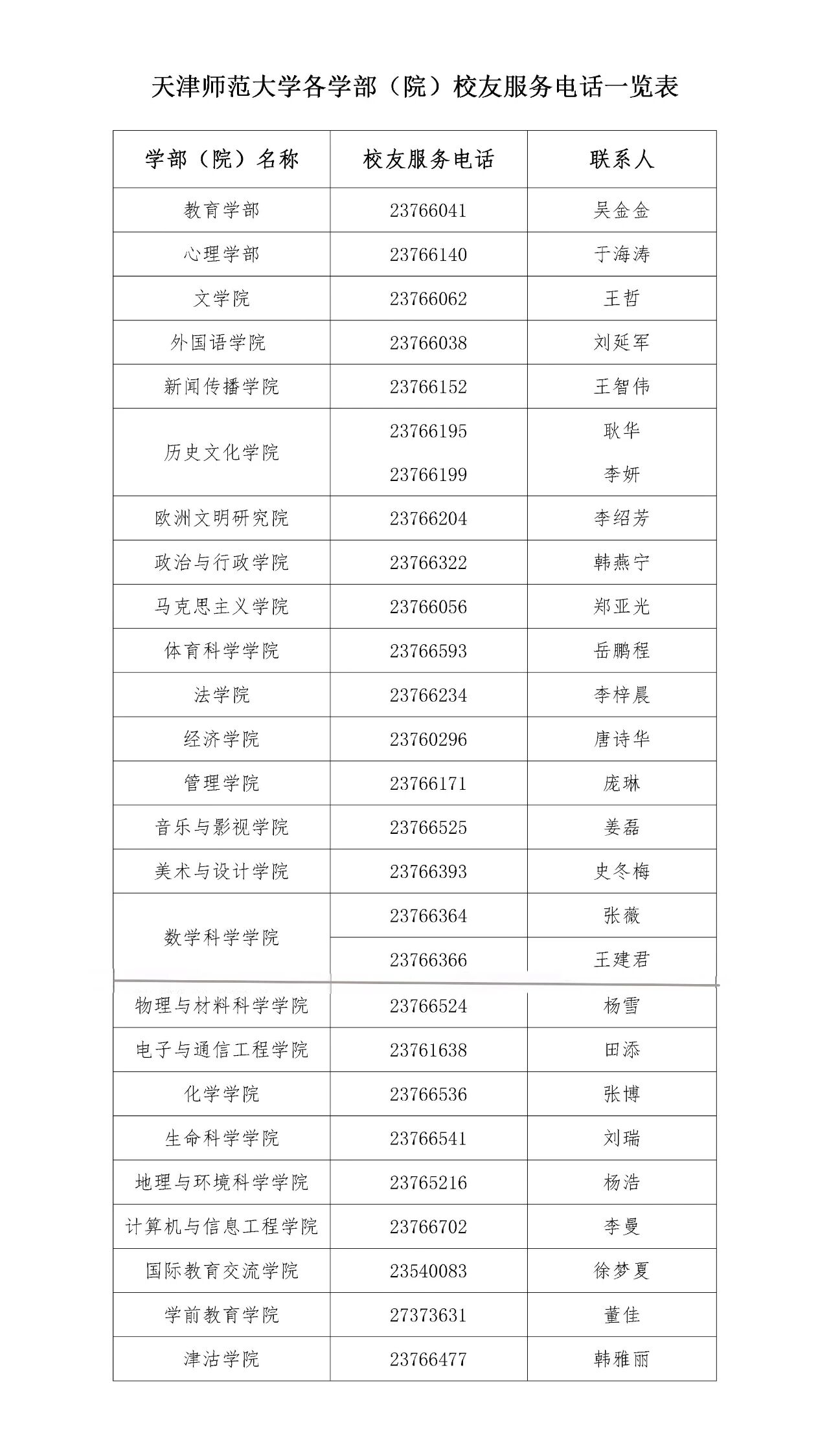 天津师范大学各学部(院)校友服务电话一览表